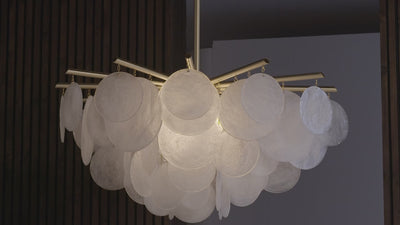 Crafted by CTO Lighting, the NIMBUS ROUND Chandelier reimagines the original design with a softly circular framework and fully curved glass profile, evoking a cloud-like silhouette. Each fritted glass disc is individually handmade by skilled artisans, forming delicate undulations and crystal-inspired textures that ensure every piece is entirely unique.