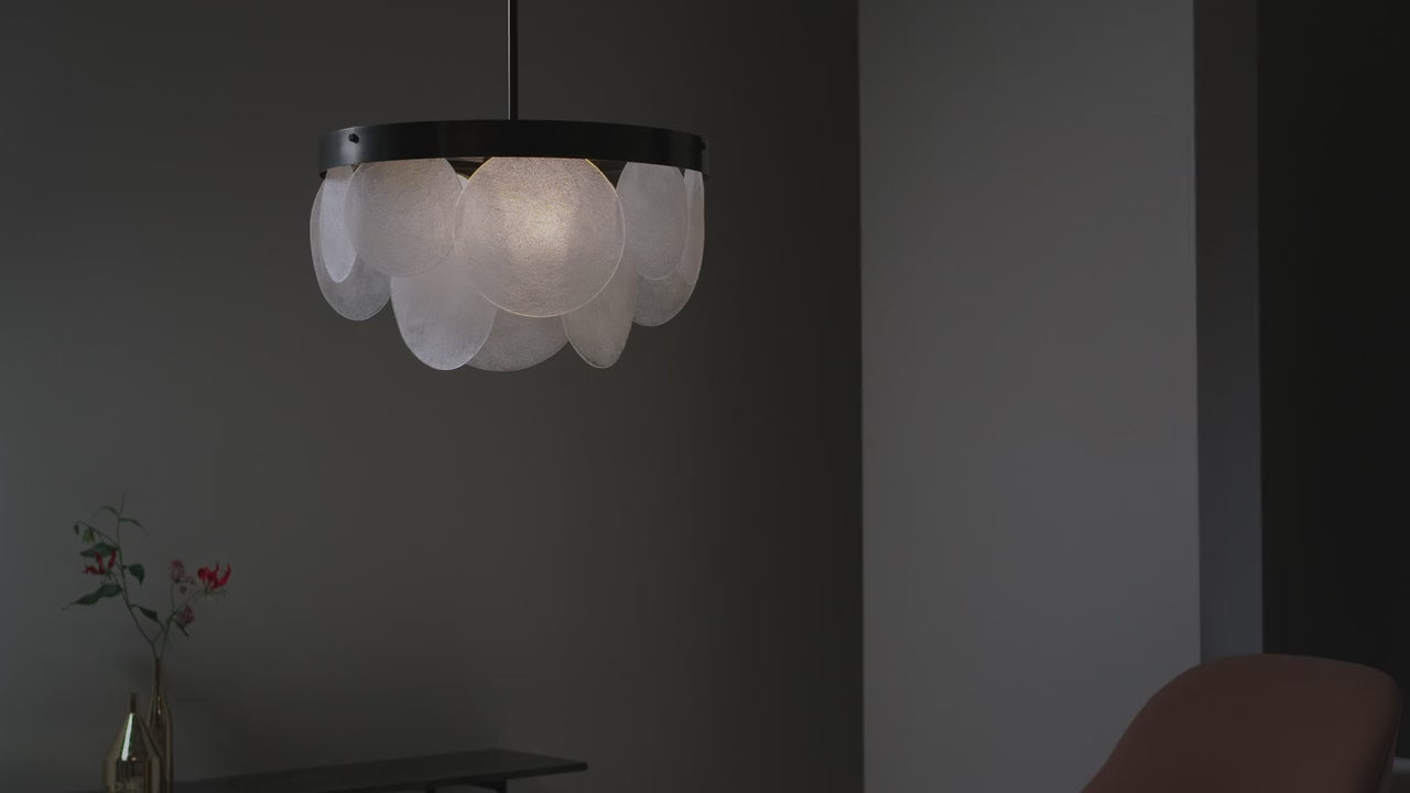 A contemporary yet timeless design, the SASHA Pendant by CTO Lighting captivates with its sculptural elegance. Each fritted glass disc is individually handmade by skilled artisans, ensuring no two pieces are ever the same. When unlit, the pendant stands as a striking art form; when illuminated, the organic glass softly diffuses light, creating a calm, atmospheric glow.