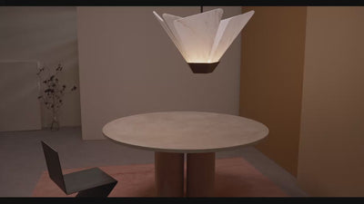 The petal-like silhouette of the pendant embraces the sharp, angular language of brutalist architecture, while the use of natural materials introduces warmth and subtlety, softening the overall aesthetic within an interior setting.